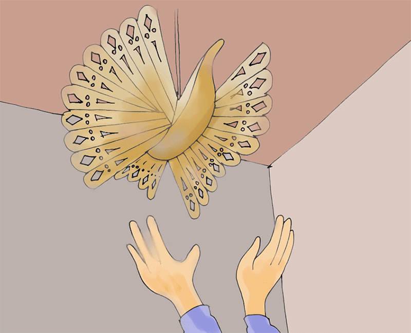 Գիշերը, տղեկին քնացած ժամանակ, հայրը փայտէ թոչունը կամացուկ կը կախէ անոր անկողինին վրայ, այնպէս, որ թռչունը դանդաղօրէն